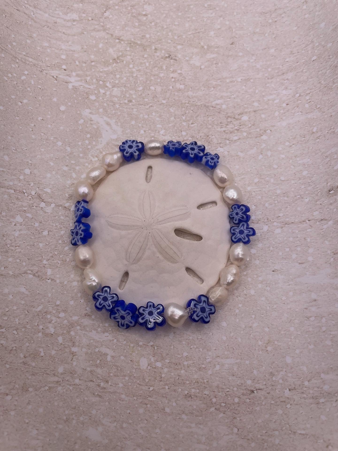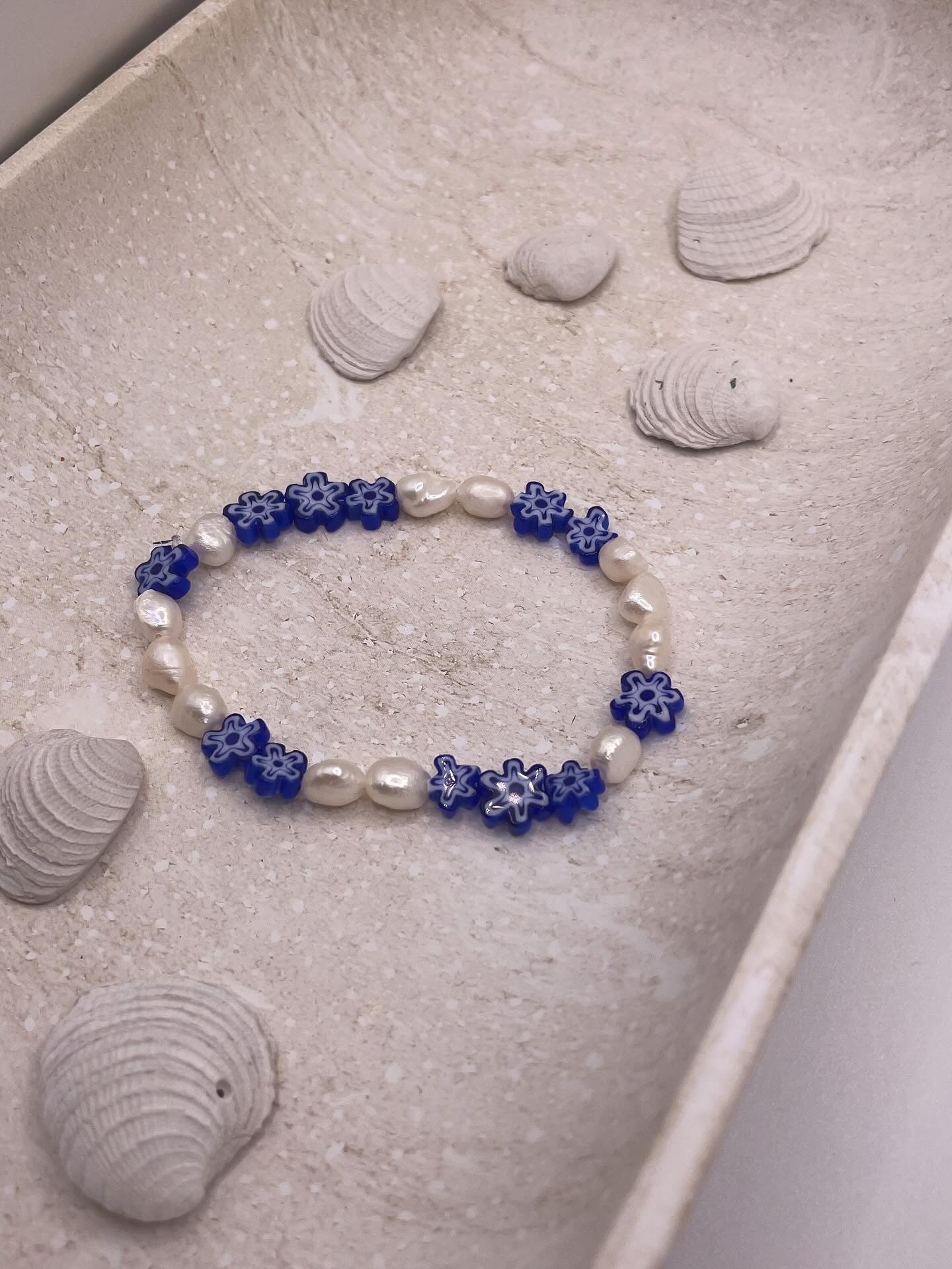 Real freshwater pearls + delicate blue flower beads. Inspired by slow mornings and still hearts.