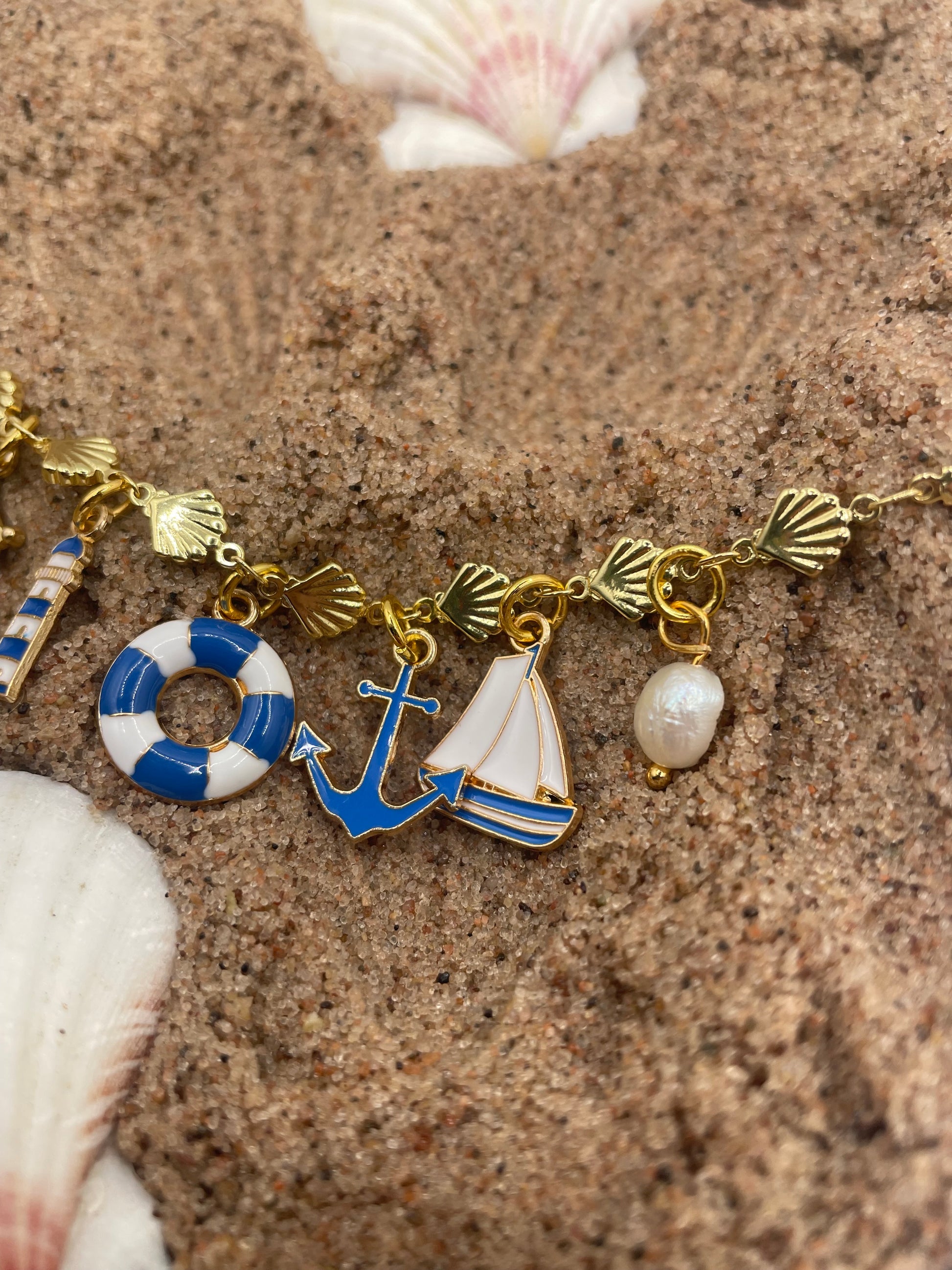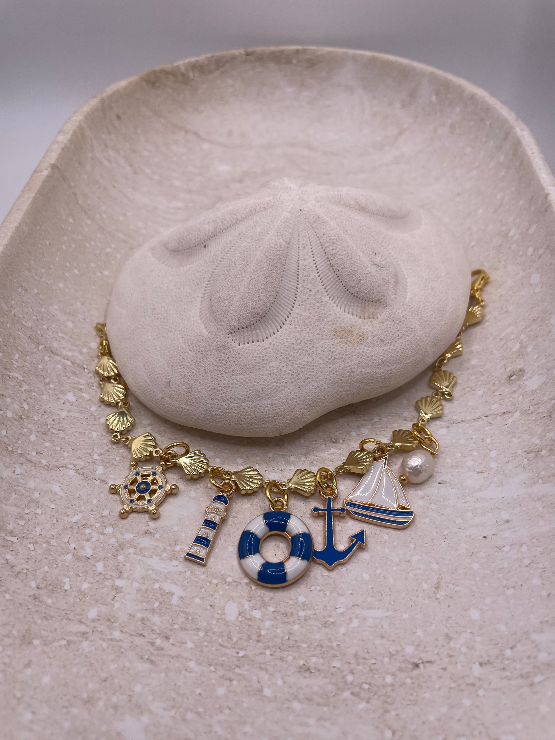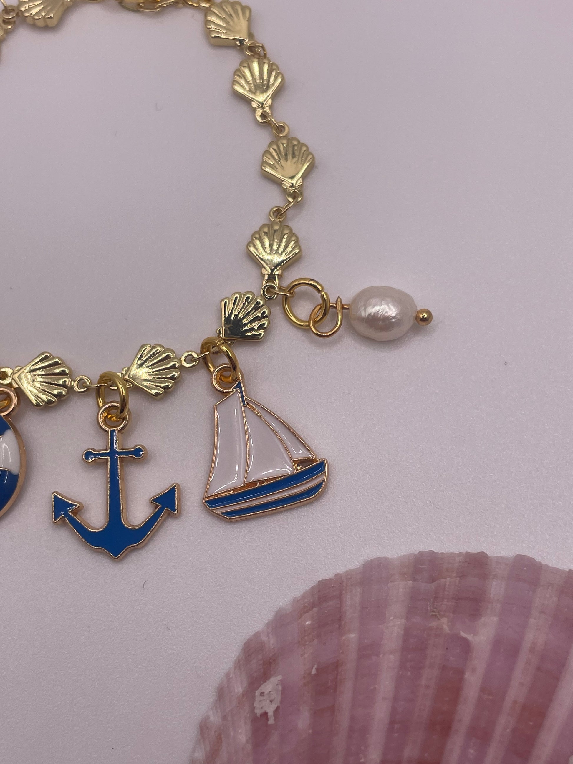 A gold-plated shell chain with tiny seaside treasures + a real pearl.